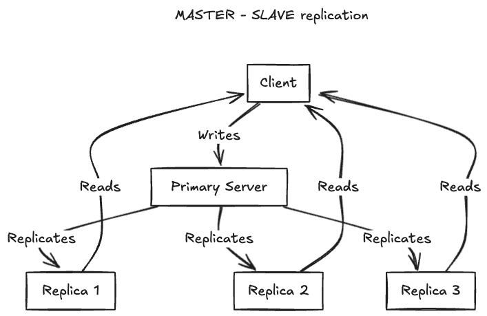 this model, one primary server handles all write operations, while multiple replica servers handle read requests.