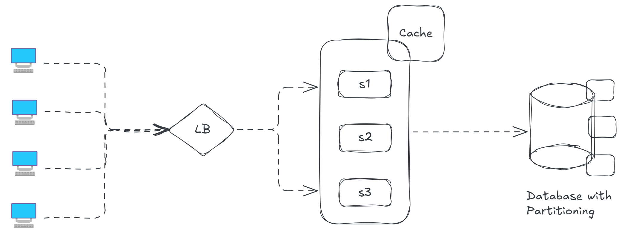 This is what are system has evolved into with large user base, load balancers, cache to our web servers and database with partitioning